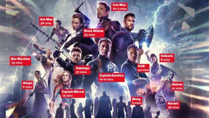 Personajes como el Capitán América y Iron Man aparecen más de una hora en pantalla cada uno, mientras que Nebula que es la que aparece más tiempo con 41 minutos. Además, de los Vengadores originales la que tiene menos tiempo en pantalla es Black Widow, con solo 33 minutos.