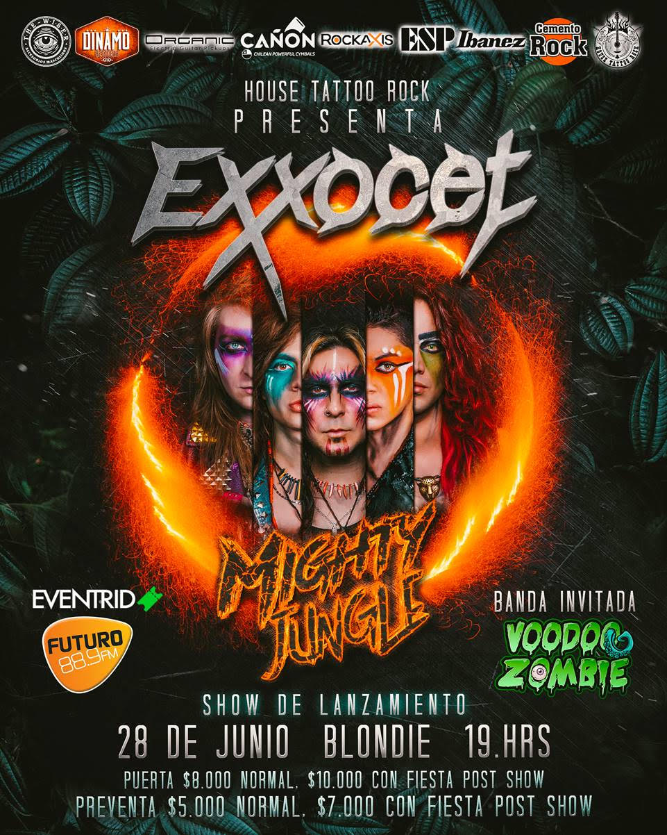 Luego de un exitoso lanzamiento digital y a modo de finalizar su primera gira nacional que los llevó a mostrar sus nuevas canciones a lo largo varias ciudades en el norte y sur del territorio chileno, la banda nacional de Hard/Glam Rock Exxocet anuncia el show de lanzamiento en vivo de su nuevo álbum “Mighty Jungle“, el cual se llevará a cabo en el CLUB BLONDIE este próximo 28 de Junio de 2019.