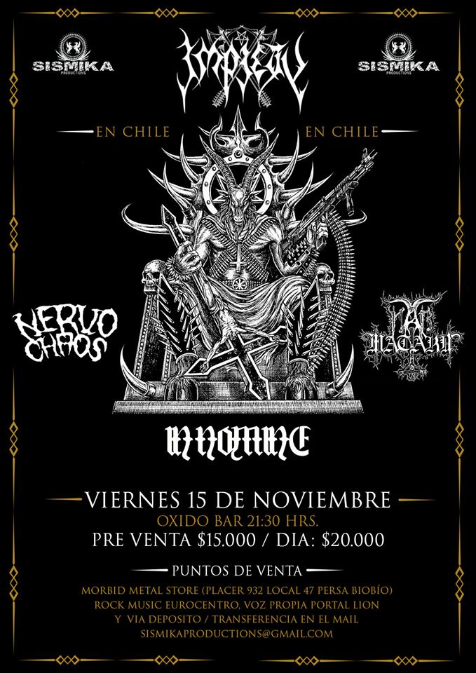Noticias Impiety se presentará por primera vez en Chile – Viernes 15 de noviembre, Óxido Bar La banda de Singapur debuta en nuestro país como parte de su gira latinoamericana. Por Jorge Lagas | 14 May, 2019. 16:48 hrs Un nuevo concierto a la cartelera: Impiety se presentará por primera vez en Chile como parte de su Latin America Ablaze Tour 2019. La banda de Singapur estará el viernes 15 de noviembre en el Óxido Bar, con Nervo Chaos (Brasil), Nar Mattaru (Santiago) e In Nomine (Valdivia). Entradas: Preventa a $15.000 en tienda Rockmusic (Eurocentro y Portal Lyon) y tienda Morbid Metal (Providencia y Persa Bío Bío). Más información en el afiche más abajo. Hace unos meses Impiety lanzó «Azazel», destacado de su disco 2019 «Versus all gods»: impiety School of Rock imparable: Inaugura nueva sede y continúa buscando nuevos cantautores junto a Atlantic Records Este sábado se realizará la XV marcha «Cultiva Tus Derechos»: Por la legalización del autocultivo de cannabis Sigue a FUTURO.cl en Google Discover Recibe nuestros contenidos directamente en tu feed. Seguir en Google Contenido patrocinado