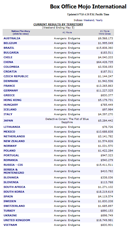 Según Box Office Mojo, mientras «Avengers. Endgame» mantiene el liderazgo en distintos territorios, el cetro de la película más popular del segundo fin de semana de mayo en Japón es para «Detective Conan: The Fist of Blue Sapphire».