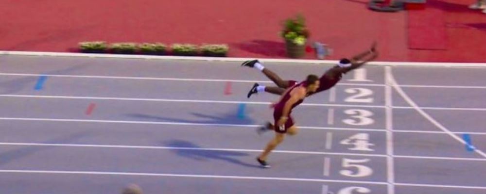 El atleta universitario logró cruzar la meta con un crono de 49 segundos y 38 centésimas, y a pesar del arriesgado salto, resultó completamente ileso.