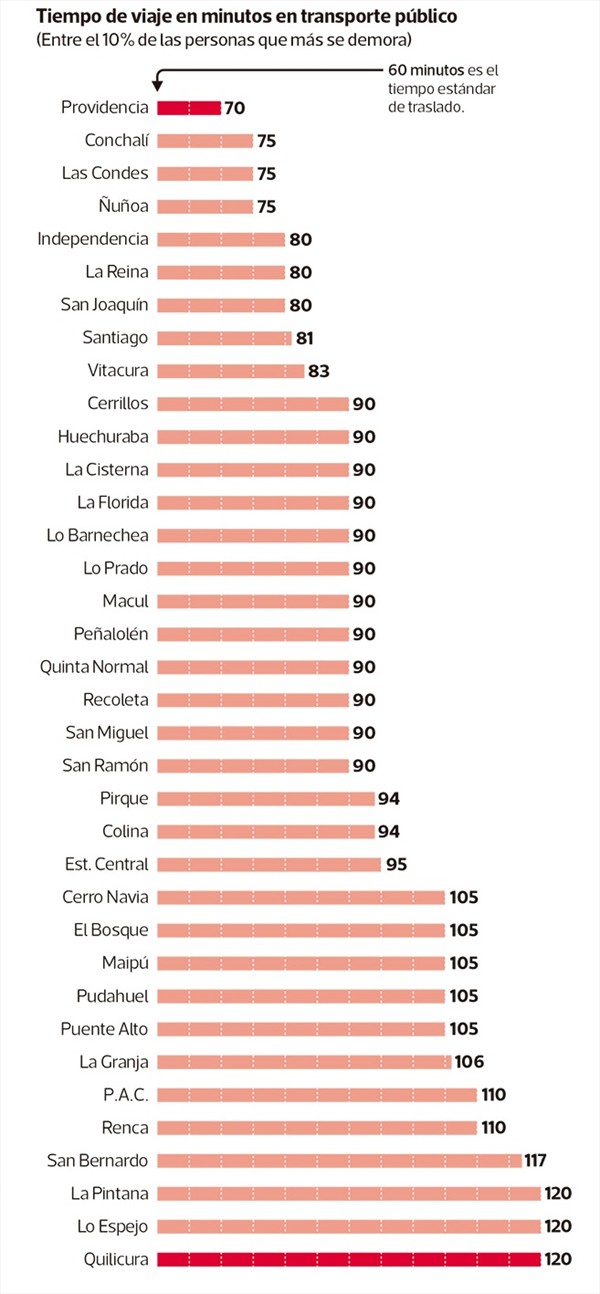 Según publica La Tercera de esta mañana, los datos reflejan que ninguna de las comunas de la capital cumple con el indicador sugerido de hasta 60 minutos si se considera al 10% de su población que más tarda.