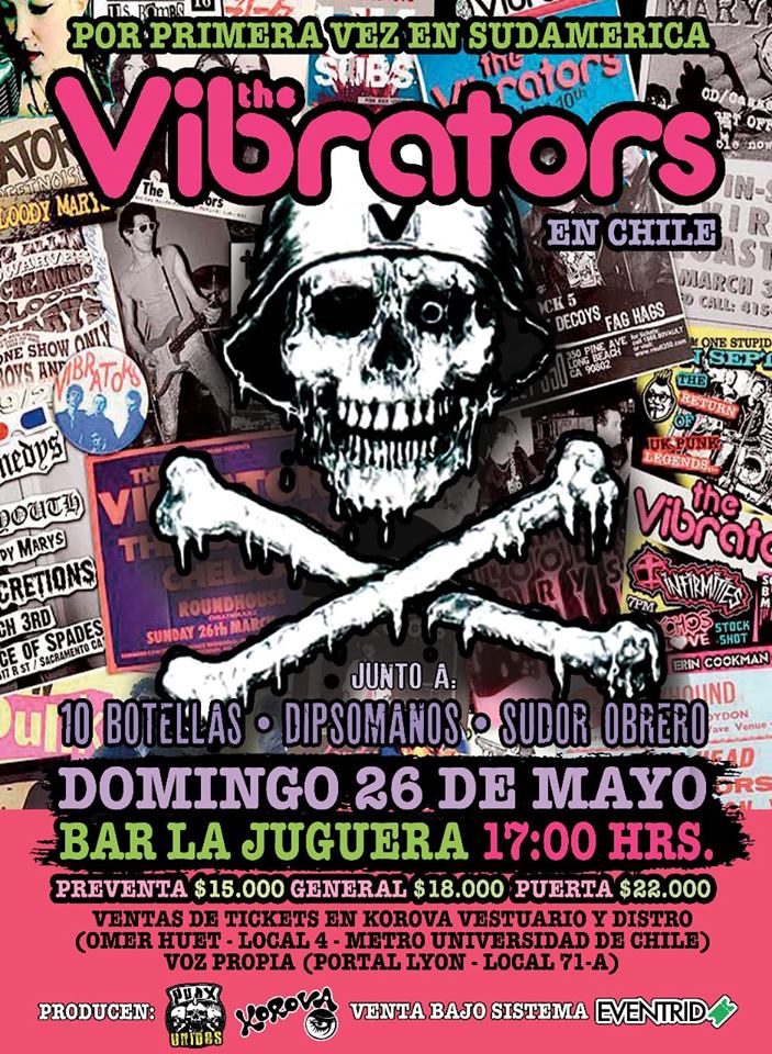 Una visita del punk rock clásico que estará pronto por acá: The Vibrators, parte de la primera oleada del punk británico, de la segunda mitad de los años 70, vienen a Chile por primera vez: domingo 26 de mayo, Bar La Juguera (Santa Filomena #126, barrio Bellavista, Recoleta).