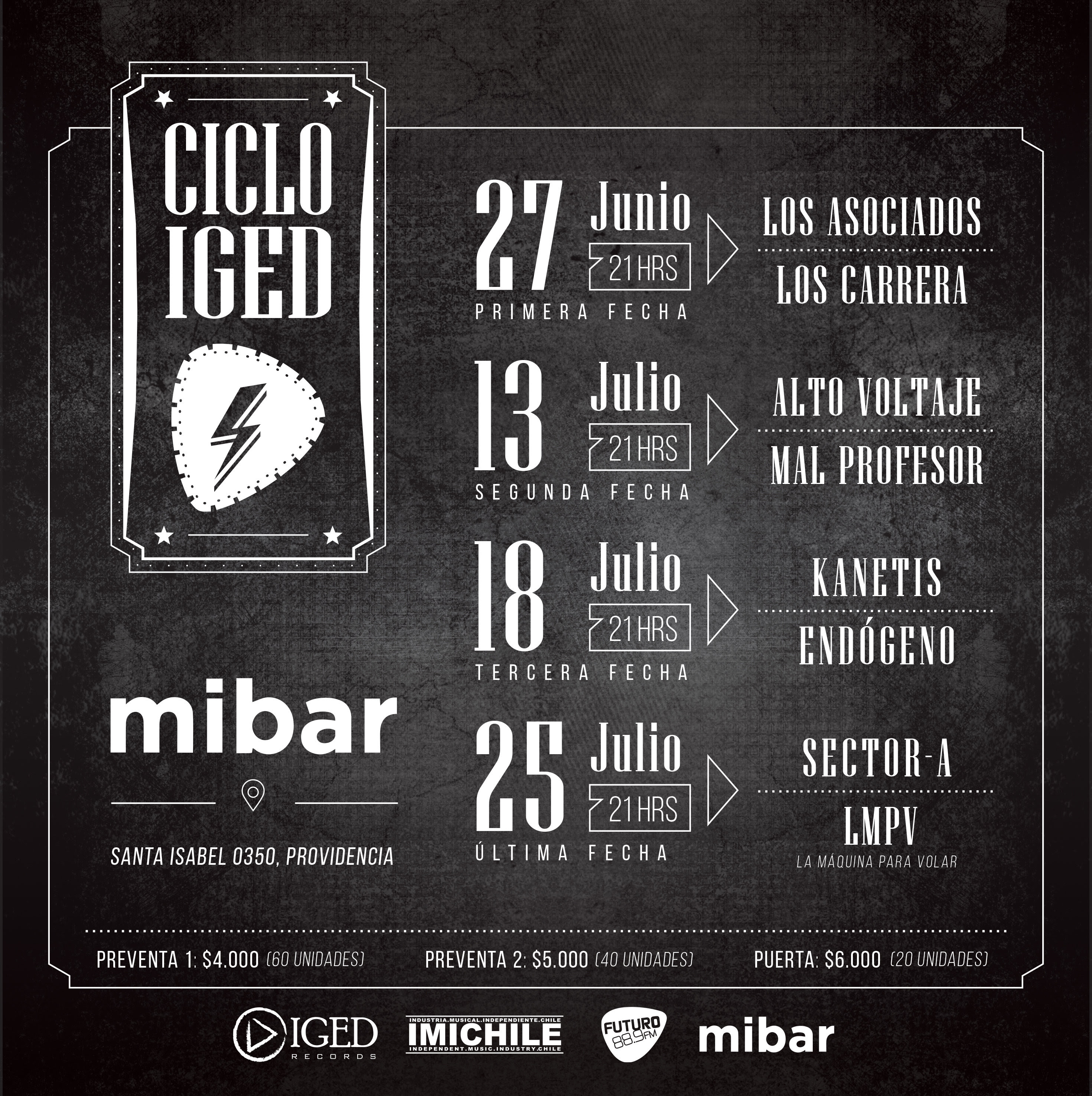 Noticias Aún quedan entradas para el Ciclo IGED 2019 en MiBar Ya están programados una serie de conciertos para el comienzo del segundo semestre en el recinto ubicado en Santa Isabel 0350, Providencia. Por Diego Puebla Hernández | 11 Jun, 2019. 16:43 hrs Ya están programados una serie de conciertos para el comienzo del segundo semestre en el recinto ubicado en Santa Isabel 0350, Providencia. IGED Records ya tiene programada una serie de conciertos para el comienzo del segundo semestre en MiBar, ubicado en Santa Isabel 0350, Providencia. Los shows son a las 21 hrs. y el programa es el siguiente: Jueves 27 de junio: Los Asociados y Los Carrera Sábado 13 de julio: Alto Voltaje y Mal Profesor Jueves 18 de julio: Kanetis y Endógeno Jueves 25 de julio: Sector A y La Máquina Para Volar. El valor de las pre ventas es de $4.000 (60 unidades) y $5.000 (40 unidades) a través del correo contacto@igedrecords.com y $6.000 en la puerta. mibar Episodio de "Black Mirror" protagonizado por Miley Cyrus es el peor evaluado de la serie Vinilos, libros y música en vivo se apoderan de la calle Orrego Luco Sigue a FUTURO.cl en Google Discover Recibe nuestros contenidos directamente en tu feed. Seguir en Google Contenido patrocinado