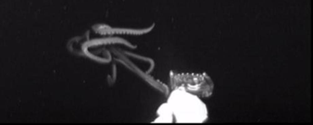 Investigadores de la Administración Nacional Oceánica y Atmosférica de Estados Unidos (NOAA) lograron grabar un calamar gigante, probablemente del género Architeuthis, en las profundidades del Golfo de México.