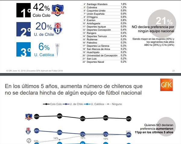 En los últimos cinco años, Colo Colo ha bajado de 45% a 42%, mientras que la «U» fue quien más perdió hinchas, cayendo desde el 26% al 20%. Por su parte, Universidad Católica solo bajó del 7% al 6%.