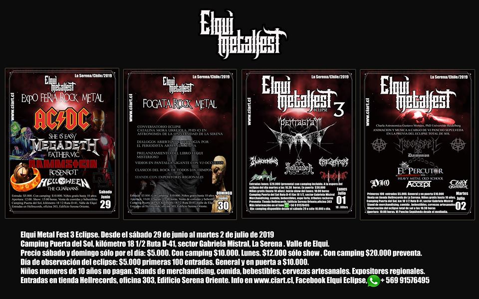 Desde algunos días antes se vivirá la tercera versión del Elqui Metal Fest, un encuentro que lleva la intensidad del sonido a esos mágicos parajes. Son 4 días, desde el sábado 29 de junio, en el Camping Puerta del Sol, kilómetro 18 y medio de la Ruta D-41, comuna de La Serena.