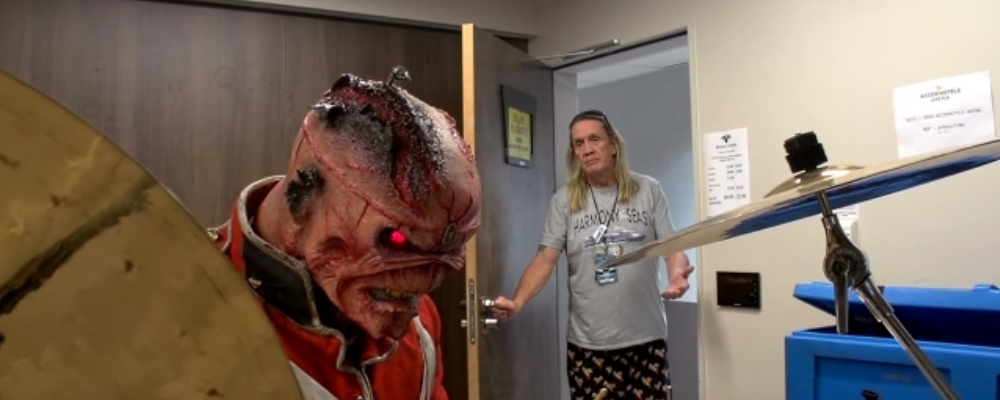 Iron Maiden ha subido un alegre video de la mascota de la banda, Eddie , que se hace cargo de la «sala de calentamiento» del baterista Nicko McBrain antes del concierto Maiden en París, Francia.