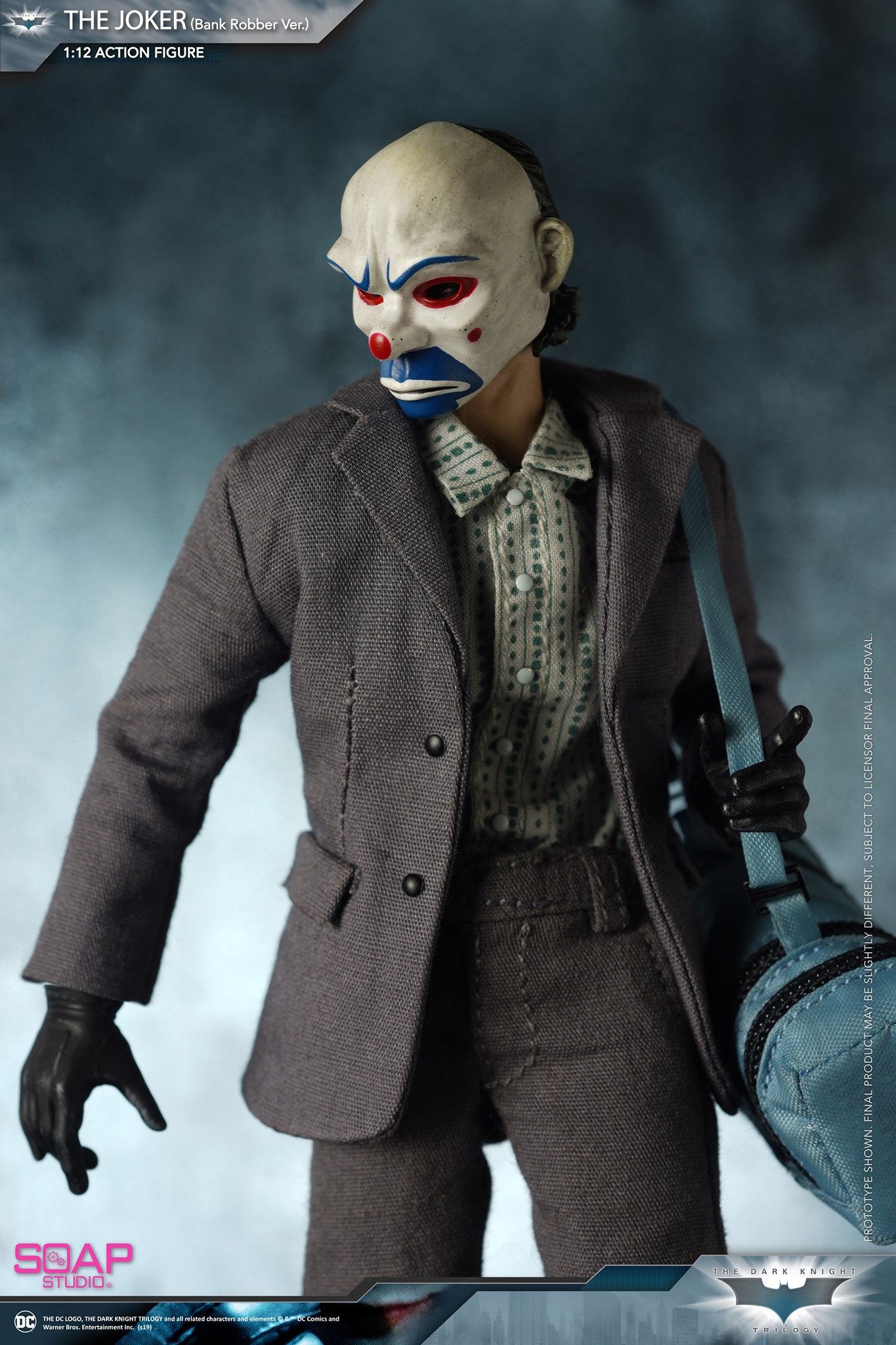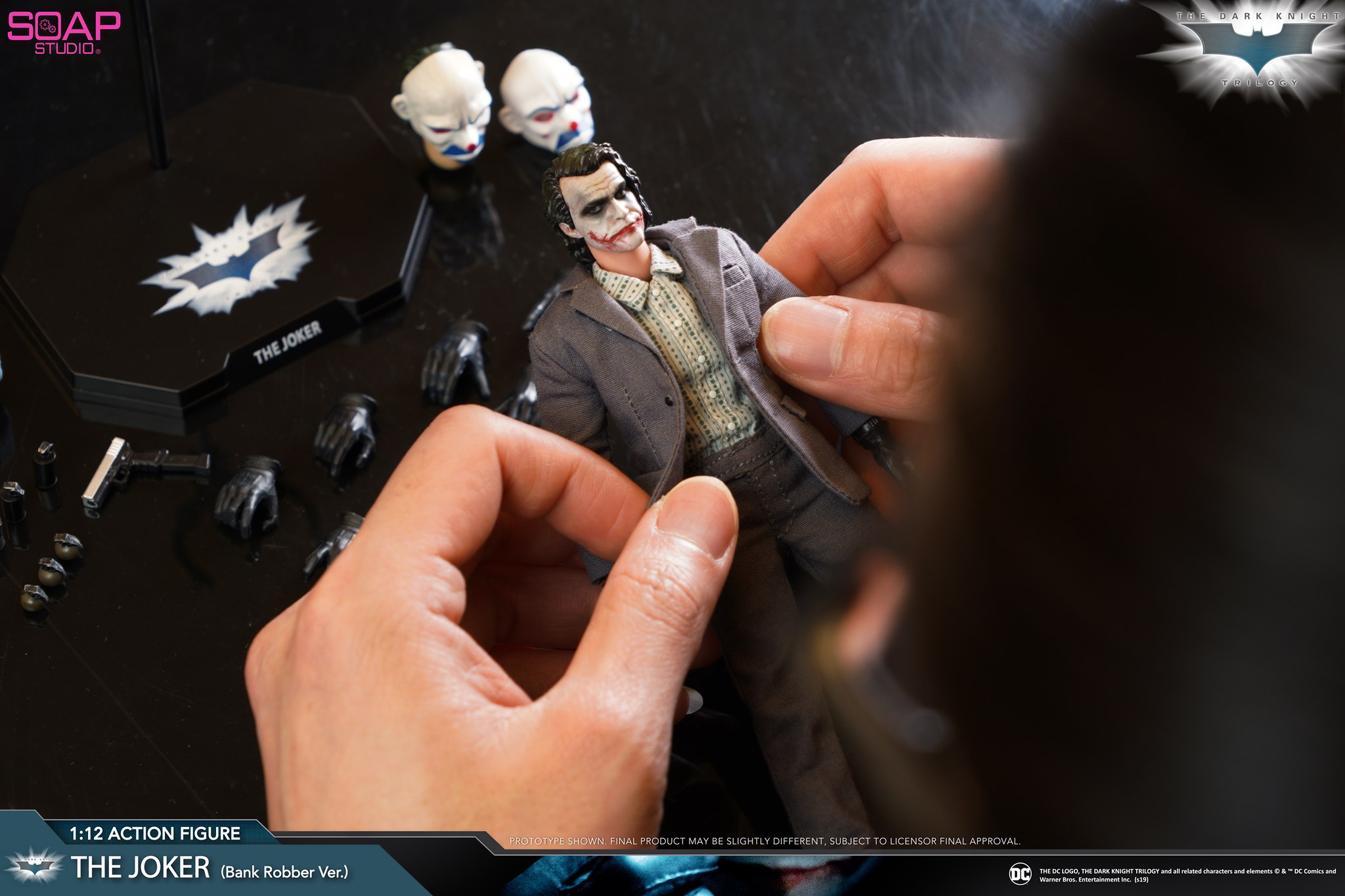 Esta fue la escena que Soap Studio replicó con su figura articulada de escala 1:12. El Joker de «The Dark Knight» no viene con su ropa clásica sino con la de esa escena. La figura tiene grandes posibilidades de articulación y poses, además de venir con varios accesorios. Estos son 2 cabezas, una con máscara y otra sin, la máscara misma, una pistola, un fajo de billetes, un reloj, 3 granada de humo, 3 granadas, un bolso, 7 pares de manos distintas, además del soporte y el fondo para mostrar la figura. Mira las imágenes de la detallada figura.