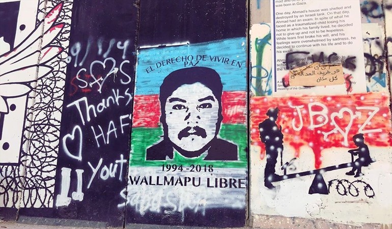 ACTITUD FUTURO Imagen de Camilo Catrillanca está en la frontera de Israel y Palestina La ilustración está acompañada por la frase "El derecho de vivir en paz". Por Diego Puebla Hernández | 25 Jun, 2019. 13:44 hrs La ilustración está acompañada por la frase «El derecho de vivir en paz». La delegación chilena que acompaña al Presidente Sebastián Piñera en Israel y Palestina, se encontró con un mural del comunero mapuche Camilo Catrillanca en Cisjordania, frontera de ambos países. «El derecho de vivir en paz» se lee en la parte superior del mural que tiene de fondo la bandera mapuche, esta frase, hace alusión a la canción de Víctor Jara. En la parte inferior, se leen los años de vida de Catrillanca, 1994 – 2018, junto con la frase «Wallmapu libre». El periodista y conductor de TVN, Mauricio Bustamente, visitó el lugar y publicó una foto en su Instagram personal. Camilo Catrillanca Dan McCafferty, ex voz histórica de Nazareth, anuncia su nuevo disco solista "Last testament" y lanza primer adelanto Los nacionales Nueve Círculos se unen a los argentinos Ultramandaco en un potente show en MiBar Sigue a FUTURO.cl en Google Discover Recibe nuestros contenidos directamente en tu feed. Seguir en Google Contenido patrocinado