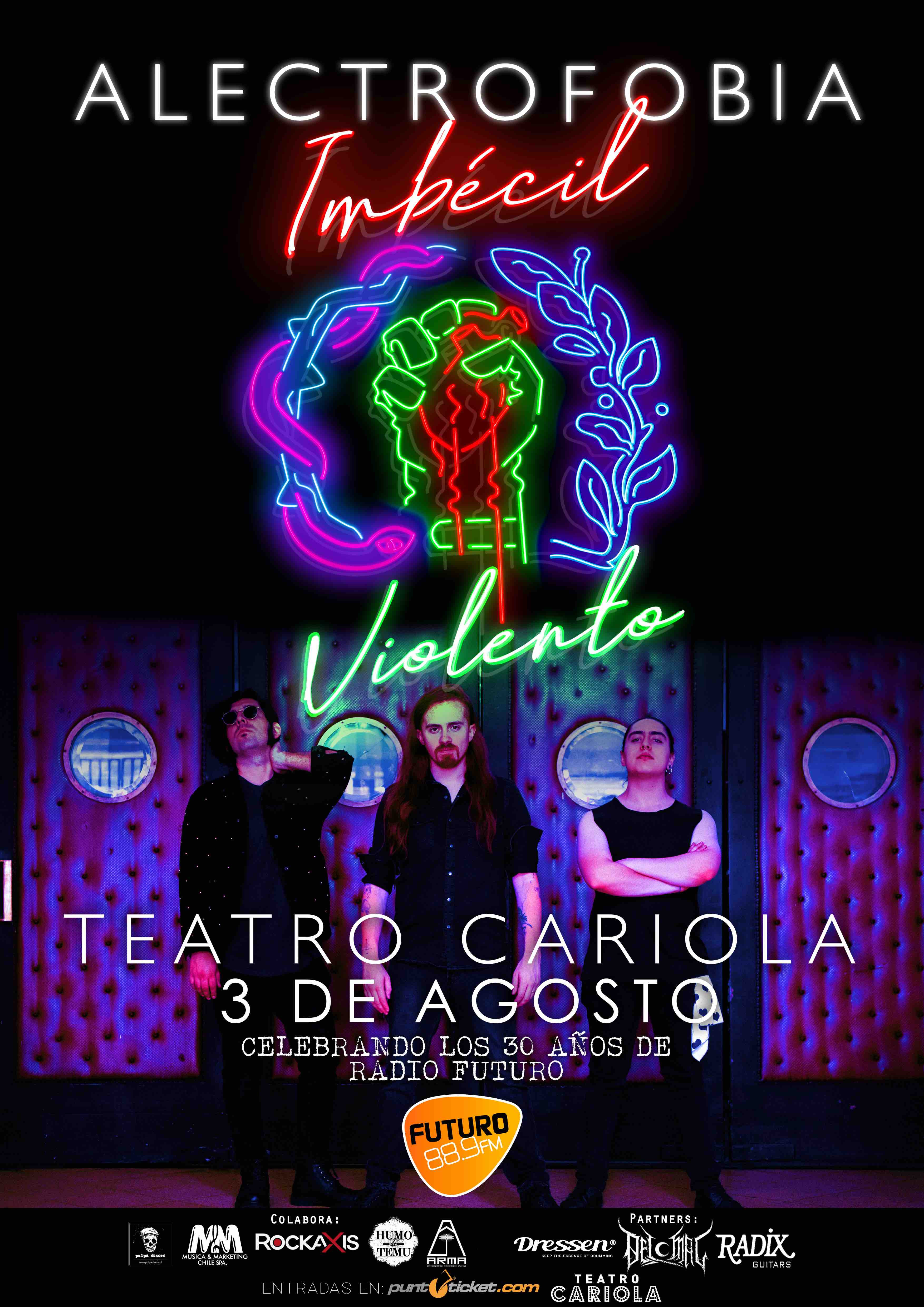 Alectrofobia, integrado por Gerardo Elgueta (bajo y voz), Rudy San Martín (guitarra) y Alonso Cabello (batería), celebrarán en esta oportunidad las tres décadas de Radio Futuro. Previamente se presentará Tierra Oscura, agrupación temuquense que fusiona el rock con elementos folclóricos, especialmente de la tradición mapuche.