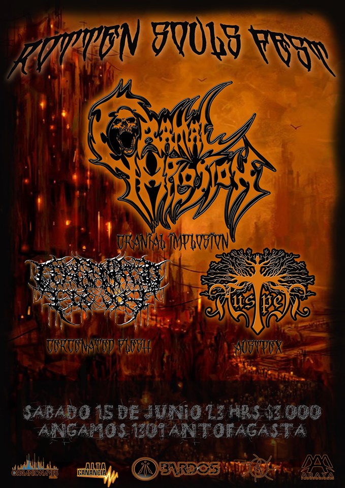 Este sábado 15 de junio tres poderosas bandas de la escena metal local se darán cita en el Rotten Souls Fest, en un concierto imperdible en el Club Bardos donde se podrá apreciar toda la fuerza de Cranial Implosion, Austpex y Cercenated Flesh en vivo, a partir de las 23 horas.