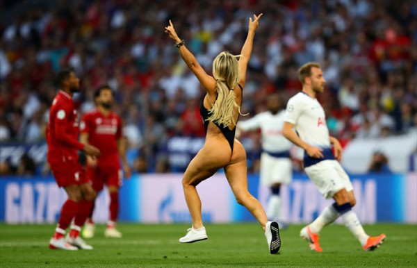 Ella llegó hasta la mitad del campo de juego antes de ser atrapada por guardias de seguridad, logrando su propósito de difundir al sitio de bromas sexuales.