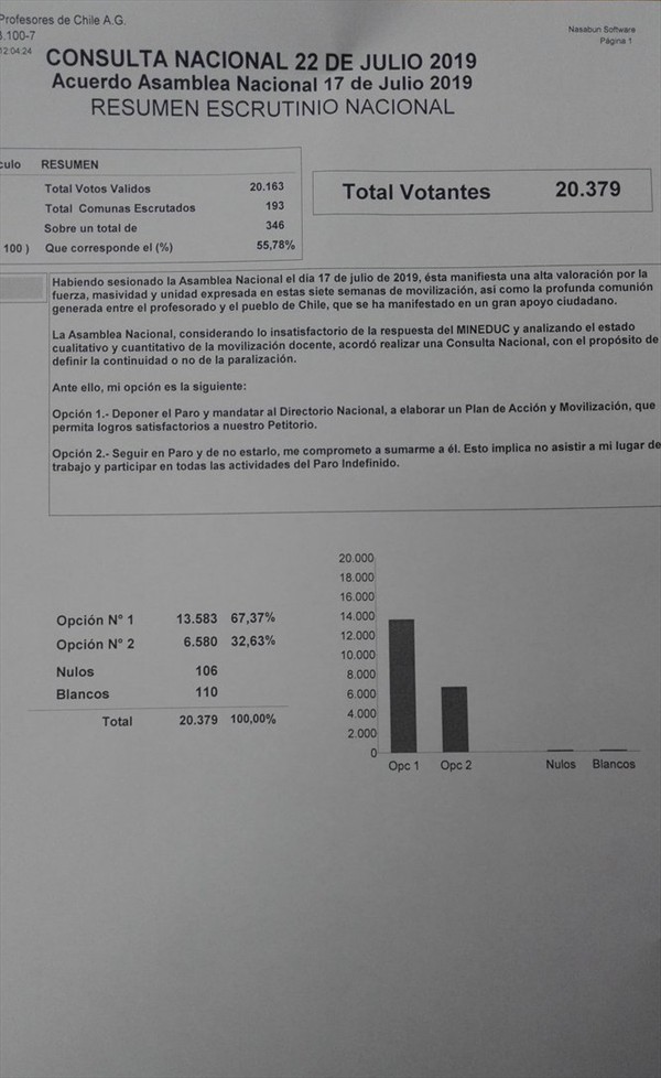 ACTITUD FUTURO Colegio de Profesores depone el paro Por un 67,37% de votos a favor, los docentes entregaron los resultados de la consulta realizada el lunes. Por Diego Puebla Hernández | 23 Jul, 2019. 15:33 hrs Por un 67,37% de votos a favor, los docentes entregaron los resultados de la consulta realizada el lunes. El paro nacional de docentes se depuso, así lo mostraron los resultados finales de la consulta realizada ayer lunes. Con un 67,37%, válido por 13.538 docentes que votaron a favor de deponer el paro, mientras que un 32,63% (6.580) pusieron como opción continuar. Pese a los resultados, el presidente del Colegio de Profesores, Mario Aguilar, aseguró que «no vamos a deponer nuestra lucha» y que «vamos a seguir en distintas formas de movilización». Profesores Beth Hart lanza "War in my mind", primer single adelanto de su próximo disco Alice Cooper lanzará un nuevo EP con Mark Farner entre sus invitados Sigue a FUTURO.cl en Google Discover Recibe nuestros contenidos directamente en tu feed. Seguir en Google Contenido patrocinado