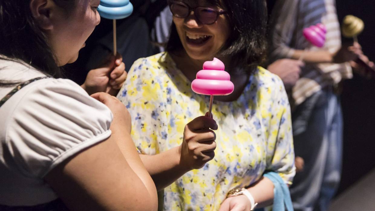 El recorrido es totalmente surreal. Los visitantes del museo reciben una introducción en video y luego se les pide que se sienten en un inodoro colorido falso y que simulen defecar (sí, en serio). Luego ellos pueden recoger un recuerdos de colores brillantes desde el interior de la taza del inodoro con forma de excremento.