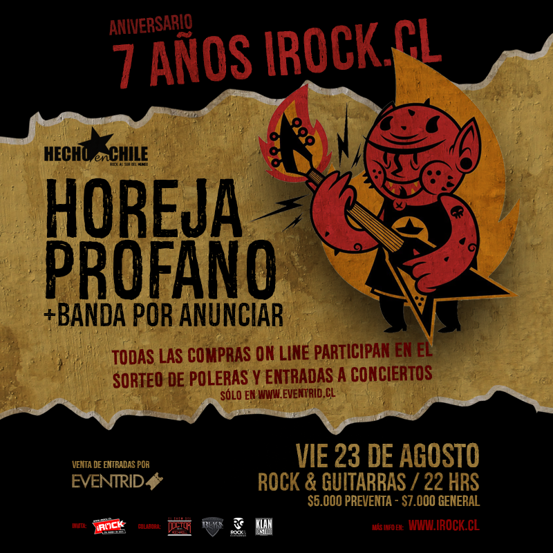 Este 23 de agosto se celebra en grande los 7 años de iRock.cl, el portal de noticias de rock y metal que ha estado desde sus inicios junto a la música nacional. La celebración será a partir de las 22 horas en el Club Rock & Guitarras, ubicado en Vicuña Mackenna 1220, Ñuñoa.