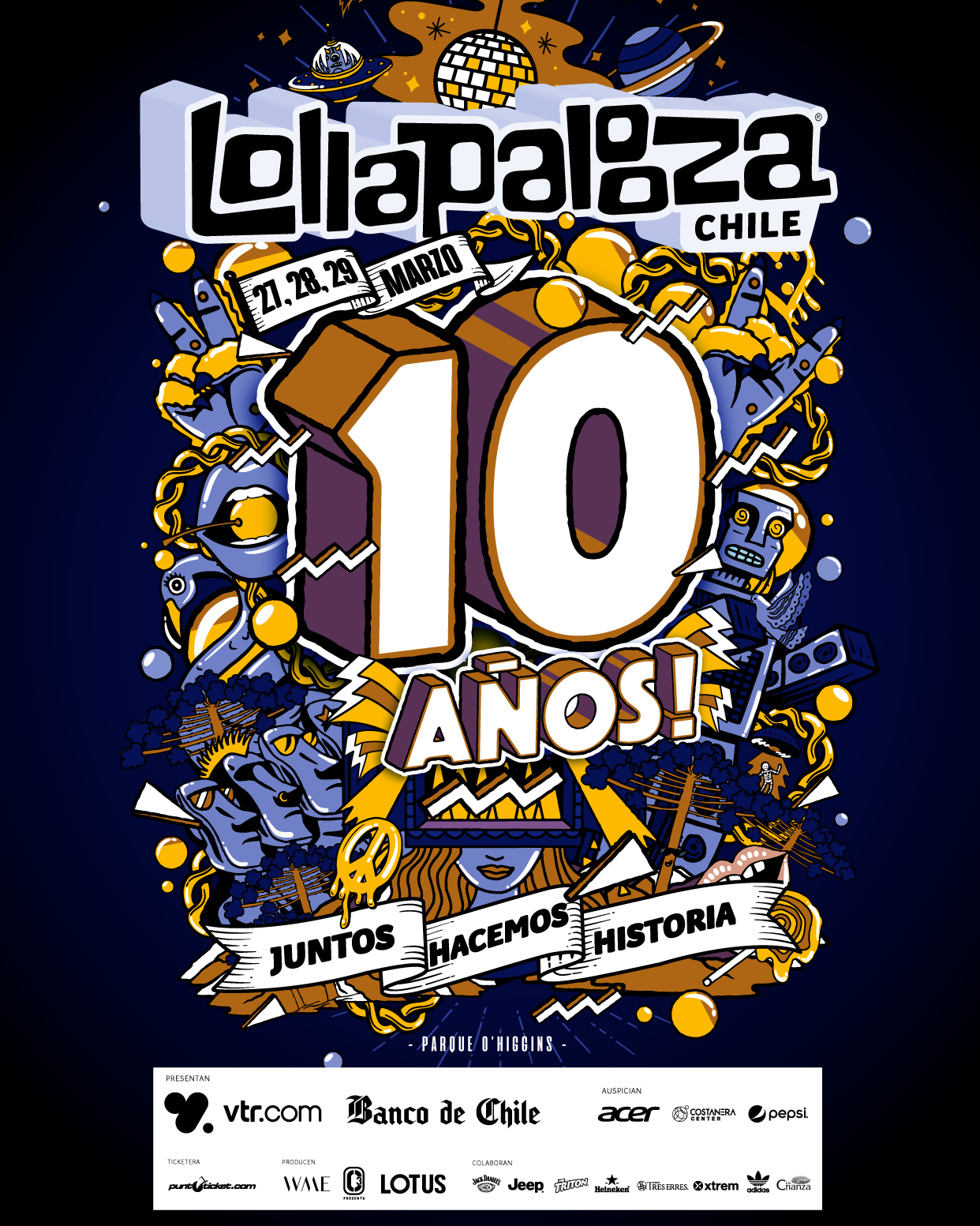 La décima edición de Lollapalooza Chile se viene con todo. Uno de los festivales más importantes del mundo y que vive en nuestro país desde 2011, se realizará los días viernes 27, sábado 28 y domingo 29 de marzo, reunirá a más de 120 artistas y festejará los 10 años del festival en nuestro país.