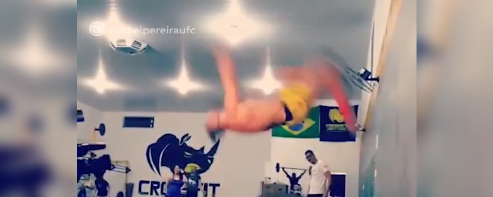 En la grabación se ve cómo Pereira toma vuelo, apoya los pies en la pared del gimnasio y da impresionantes volteretas en el aire antes de caer de pie. Y lo más impresionante, el luchador repite la misma acrobacia sin apenas moverse del sitio donde estaba.