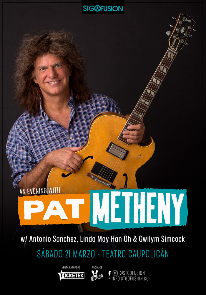 Pat Metheny, el guitarrista de jazz más destacado de las últimas décadas, regresa a Chile repasando su exitosa carrera en un show de lujo el sábado 21 de marzo en el Teatro Caupolicán, para celebrar los 12 años del ciclo Stgo Fusión, que ha traído a grandes nombres como Maceo Parker, Chick Corea, Steven Wilson, Toe, Magma, Tortoise, Snarky Puppy y Tony Lewin.