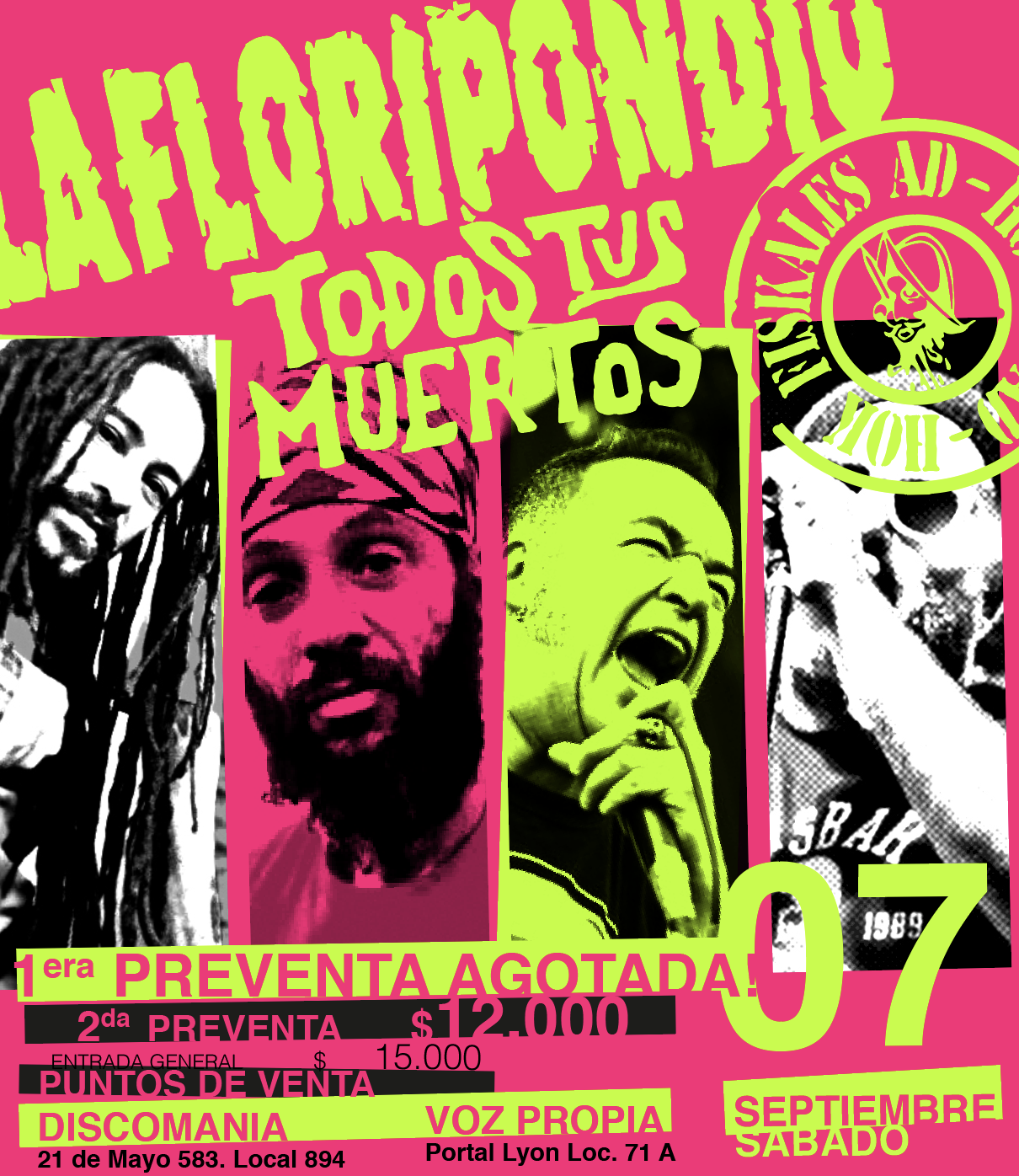 Noticias Todos Tus Muertos, La Floripondio y Fiskales Ad-Hok protagonizan el Festival Sudamerican Rockers en Santiago El sábado 7 de septiembre estarán en La Cúpula. Al día siguiente, la banda argentina y la de Macha Asenjo estarán en Villa Alemana. Por Jorge Lagas | 03 Jul, 2019. 16:54 hrs Un nuevo festival de rock latinoamericano se armó para septiembre: Festival Sudamerican Rockers, con Todos Tus Muertos (Argentina), La Floripondio (Chile) y Fiskales Ad-Hok (Chile), el 7 de septiembre en La Cúpula. Eso no es todo, porque Todos tus Muertos y La Floripondio también van a tocar en Villa Alemana el 8 de septiembre, en el Club Peña Blanca. Y antes van a estar juntos en Argentina, en Córdoba y Buenos Aires. Para Santiago, entradas en en Passline.cl a $12.000. Y en Voz Propia. todos tus muertos Eric Clapton tiene nueva guitarra Sospechoso: Árbitro a cargo del VAR aseguró que notificó de dos penales a Argentina que no fueron cobrados Sigue a FUTURO.cl en Google Discover Recibe nuestros contenidos directamente en tu feed. Seguir en Google Contenido patrocinado