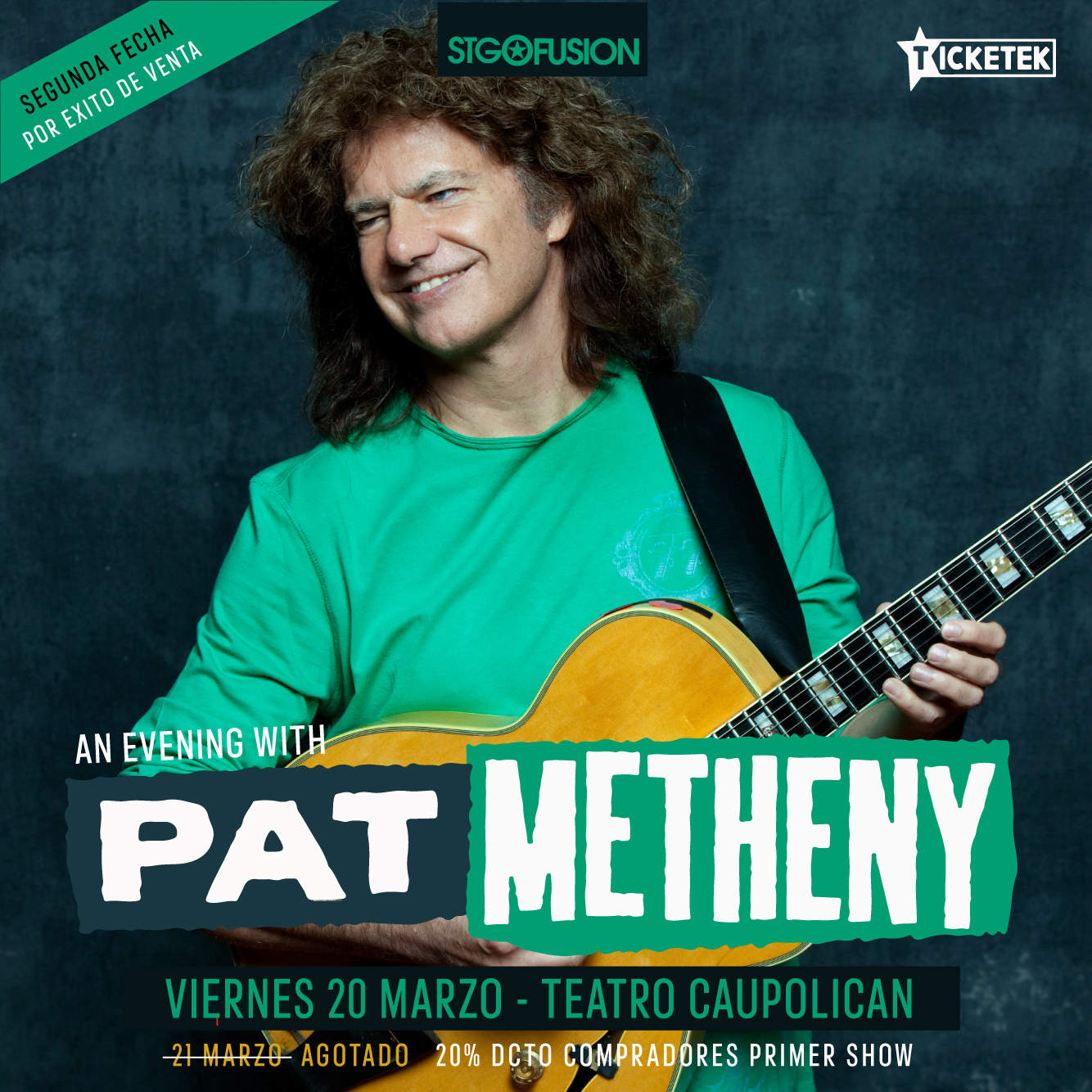 CONCURSOS CONCURSO // Ganadores de entradas a Pat Metheny en Chile Este lunes 12 de agosto comenzó la venta de entradas para su segundo show en Santiago en 2020 y a modo de lanzamiento, sorteamos invitaciones. Por Jorge Lagas | 12 Ago, 2019. 12:31 hrs Este lunes 12 de agosto a las 11 AM comenzó la venta de entradas para el segundo show de Pat Metheny en Chile, el 20 de marzo en el Teatro Caupolicán. El primero, que es el 21, ya está agotado. La venta es por Ticketek desde $28.000. Y a modo de lanzamiento, durante esta semana sorteamos algunas entradas. Ya están los ganadores: Susana Carolina Cabezas Cabezas Gregorio Robinovich Pat Metheny Leonardo DiCaprio reveló la razón por la que no fue Anakin Skywalker en "Star Wars" Confirmado: Los legendarios Mayhem lanzan disco en octubre Sigue a FUTURO.cl en Google Discover Recibe nuestros contenidos directamente en tu feed. Seguir en Google Contenido patrocinado