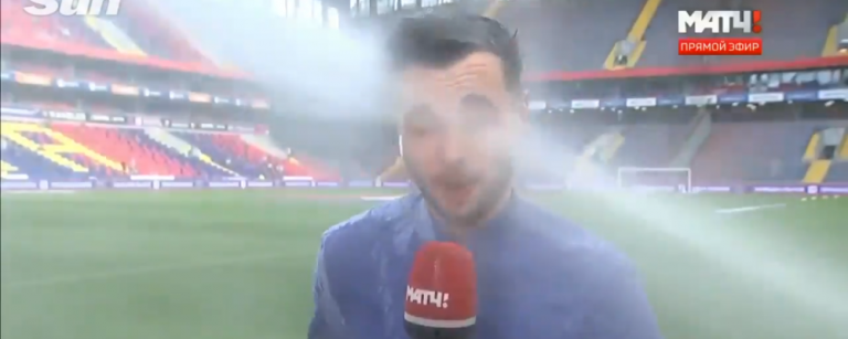 Sin embargo, cuando comenzó a dar la noticia, los aspersores de la cancha del estadio CSKA de repente se activaron a su alrededor, dejando al periodista completamente empapado.
