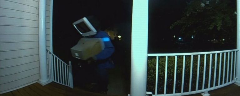 Las imágenes de las cámaras de vigilancia registraron a una misteriosa persona con algo parecido a un televisor puesto sobre la cabeza llevando los dispositivos a las puertas de los vecinos por la noche.