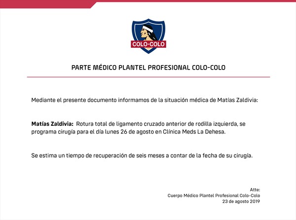 Lo que comenzó como un rumor la mañana de este viernes, con el paso de las horas se confirmó. Matías Zaldivia sufrió rotura del ligamento cruzado de su rodilla izquierda y se perderá lo que resta de temporada con Colo Colo.