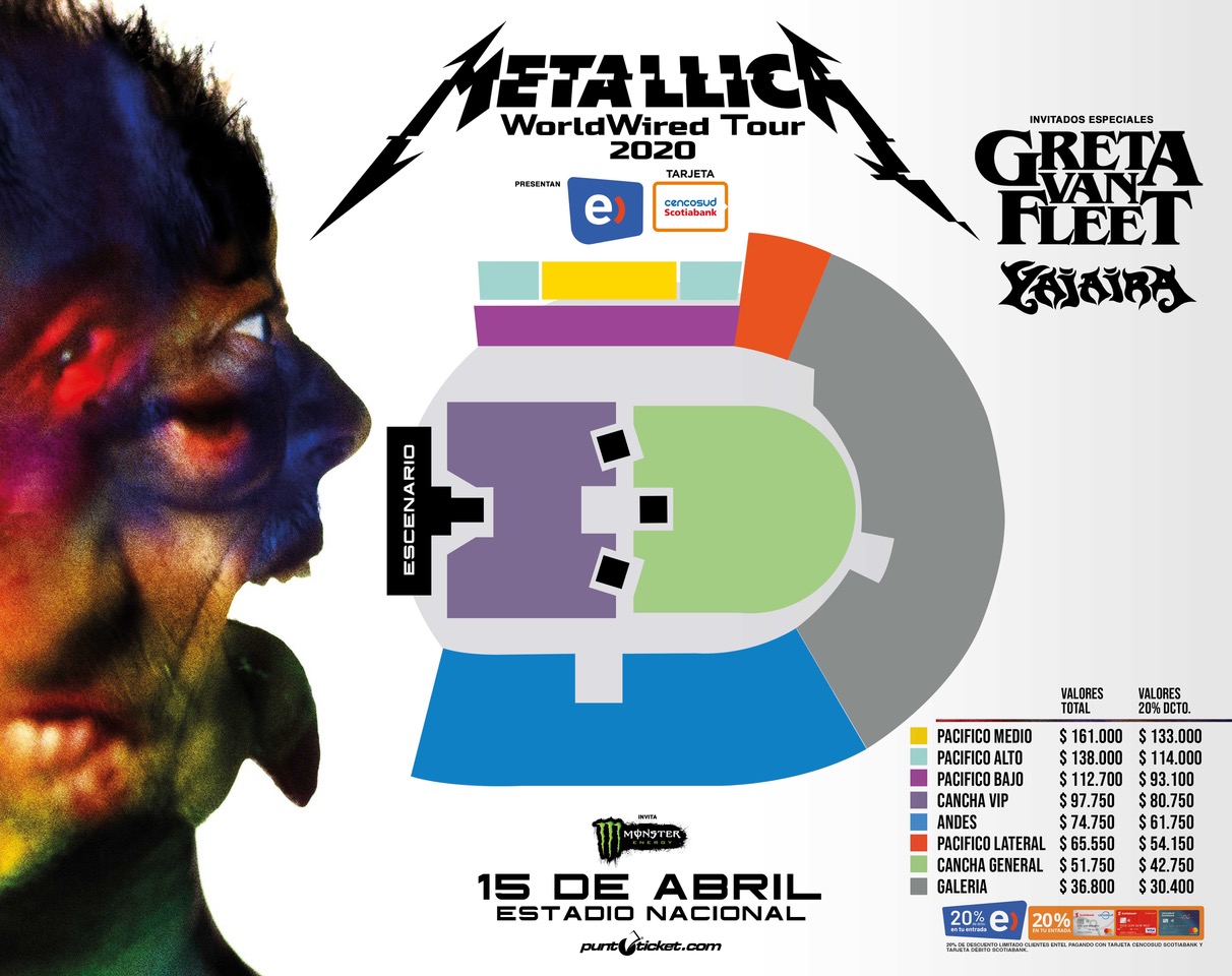 La venta general para el regreso de Metallica a Chile arranca a las 11.01 hrs de mañana jueves 22 de agosto a través de Puntoticket. Revisa precios y localidades a continuación…