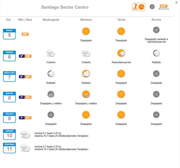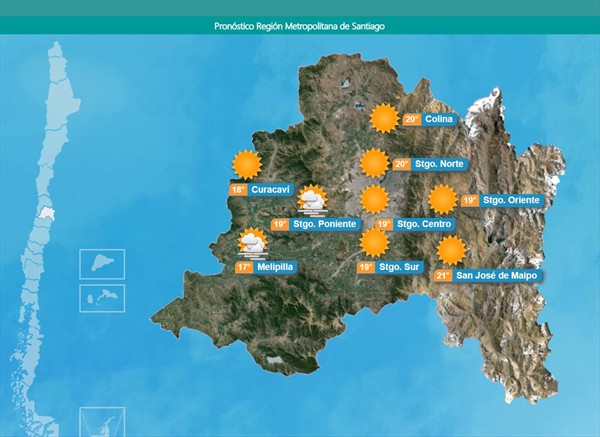 ACTITUD FUTURO Mira el pronóstico del tiempo para este lunes Además revisa la semana completa en la Región Metropolitana. Por Diego Puebla Hernández | 05 Ago, 2019. 09:44 hrs Además revisa la semana completa en la Región Metropolitana. Este lunes 5 de agosto seguirá soleado en la Región Metropolitana, según la Dirección Meteorológica de Chile. La temperatura mínima fue de 5°C, pero la máxima será de 19 grados con un cielo totalmente despejado. Eso sí, los grados bajarán desde este martes por el resto de la semana, donde solo habrá una mínima de 6°C este martes y miércoles, mientras que el jueves y viernes solo 1°C. Por su parte, el tope de temperatura todos estos días será de 15°C y 16°C con cielos nublados. el tiempo Fanático de Avengers: Endgame mezcló imágenes de la película con Black Sabbath Fallece Gustavo Pradenas, emblemático contertulio de "Show de Goles" Sigue a FUTURO.cl en Google Discover Recibe nuestros contenidos directamente en tu feed. Seguir en Google Contenido patrocinado