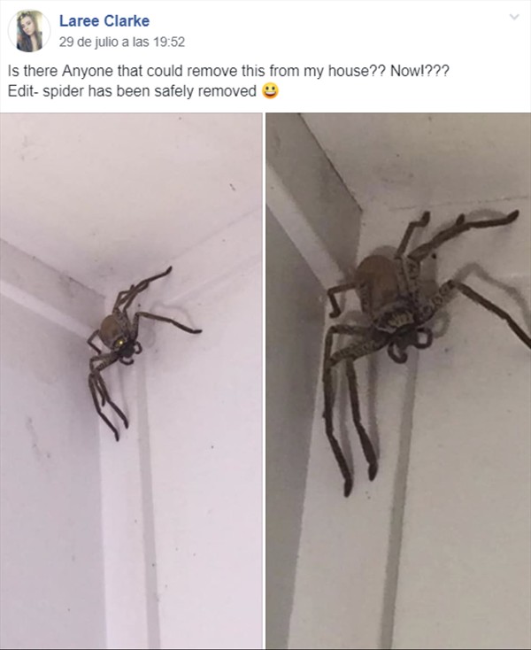 A través de Facebook, Laree Clarke publicó fotografías de una gran araña en un grupo de la plataforma junto a un mensaje que decía: «¿Hay alguien que pueda sacar esto de mi casa?».