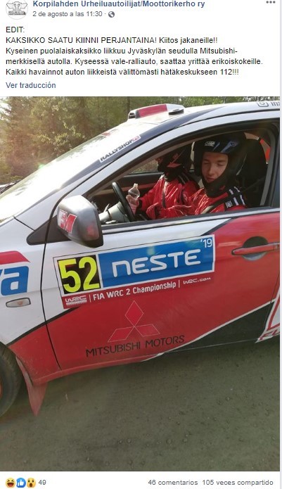 Los sujetos, ambos de 30 años, fueron controlados por la policía local el viernes en la noche cerca de Jyväskylä, en una carretera secundaria. Los polacos e desplazaban en un Mitsubishi Lancer con sellos del Neste Rally Finland, los que resultaron ser falsos. Además, como es sabido, el Lancer es un auto de producción y no está homologado para la serie WRC2 (como decía el sticker). También llevaban cascos y trajes de piloto, como sin estuvieran listos para una carrera.