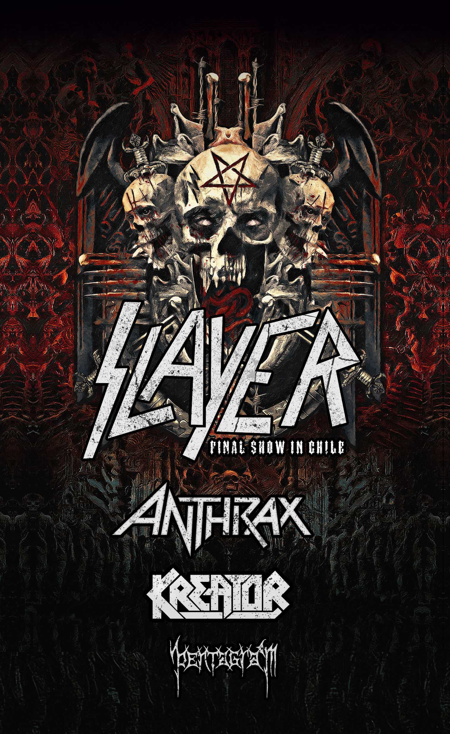 El esperado festival que reúne a 4 leyendas del metal más extremo, con Slayer, Anthrax, Kreator y los chilenos Pentagram, el domingo 06 de octubre en el Estadio Bicentenario la Florida.