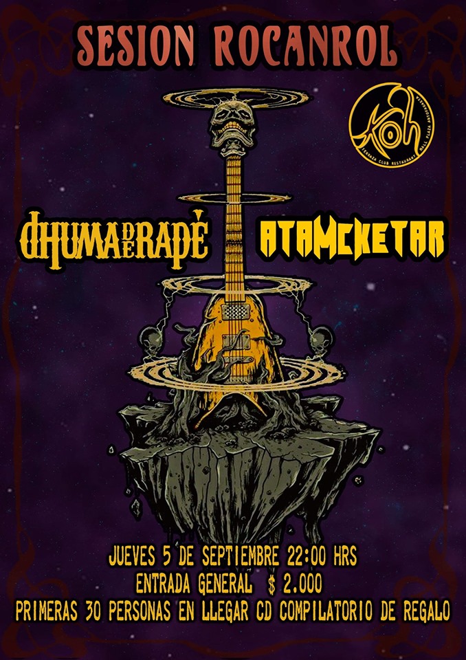 Este jueves 5 de septiembre dos poderosas bandas de rock de la ciudad, Dhuma de Rapé y Atamcketar, se darán cita en KOH Multiespacios, ubicado en las Terrazas de Mall Plaza, a partir de las 22 horas, en un concierto inédito donde presentarán lo mejor de sus canciones hasta sus creaciones más recientes.