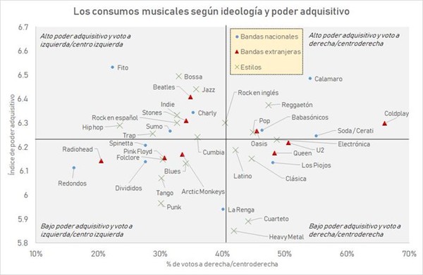 «Las bandas/estilos que están arriba del mapa son consumidos relativamente más por personas de clase media para arriba. A la inversa con las que están abajo», agregó, especificando que «la clase media para arriba» incluye refiere un alto nivel educativo, con salud privada, un «empleo de calidad» y con un elevado gasto de vacaciones.