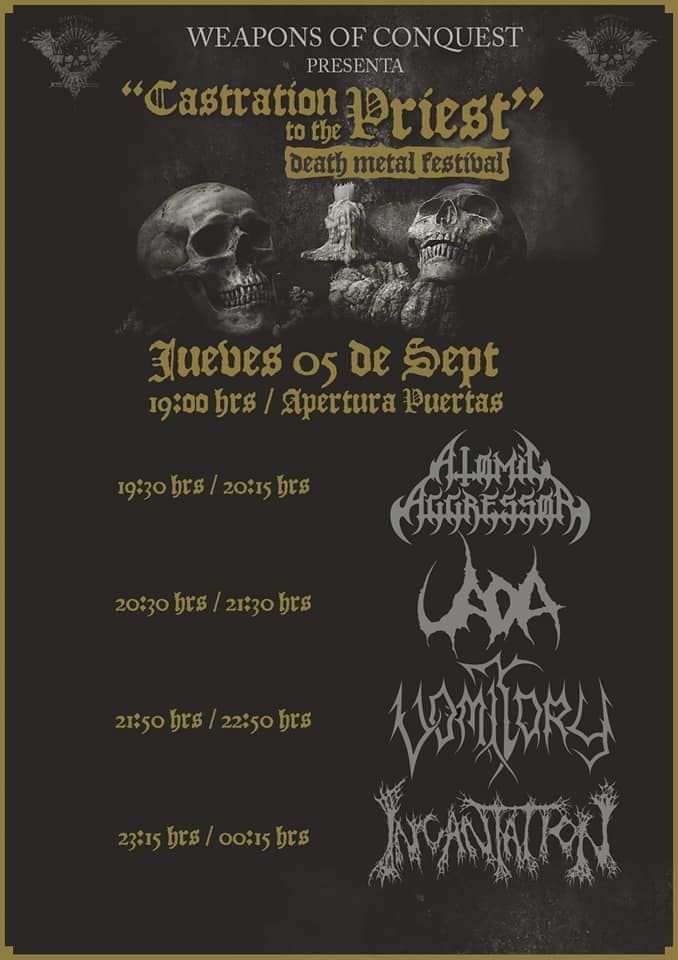 Este jueves 5 y viernes 6 de septiembre se realiza en Santiago el festival Castration to the Priest, orientado al metal más extremo, que en esas dos jornadas se toma el Club Blondie, marcadas por el regreso de Incantation y el debut en nuestro país de Dead Congregation, Vomitory, Rotten Sound, Uada y Full of Hell. También estarán los nacionales Atomic Aggressor y Magnanimus.