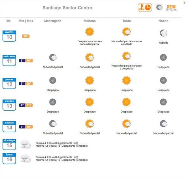 ACTITUD FUTURO Frío: Revisa el pronóstico del tiempo para este martes en Santiago El día estará despejado con nubosidad parcial. Por Hector Muñoz Tapia | 10 Sep, 2019. 07:45 hrs El día estará despejado con nubosidad parcial. Por ADN.cl Con una mínima de solo 4 grados comenzó este martes 10 de septiembre luego de -por fin- un poco de lluvia en Santiago. Según informa la Dirección Meteorológica del Chile, el día estará despejado variando a nubosidad parcial, marcando los termómetros una máxima de 15 grados. Asimismo, para este miércoles 11 de septiembre pronostican nubosidad parcial con una mínima de 6°C y 16°C de máxima. Por su parte, el jueves estará un poco más helado con solo 3 grados al comienzo del día, y 20 grados de tope en un día soleado. Finalmente, este viernes previo a las Fiestas Patrias, se espera una mínima de 4°C y una máxima de 21 grados con un cielo totalmente despejado. frío pronóstico Carlos Ibáñez, jefe unidad de adicciones Hospital Clínico U. de Chile: "Más de 130 mil muertes al año son atribuidas al alcohol" Amigos inseparables: el emotivo abrazo dos niños que llevaban dos días sin verse Sigue a FUTURO.cl en Google Discover Recibe nuestros contenidos directamente en tu feed. Seguir en Google Contenido patrocinado