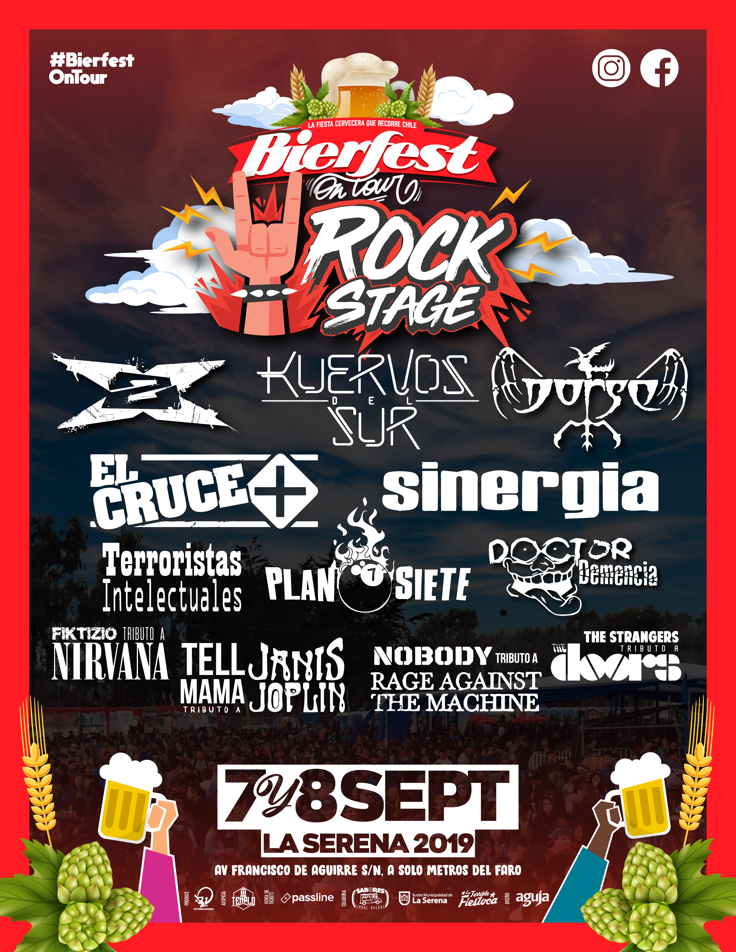 El 7 y 8 de septiembre en el Rockstage; Kuervos del Sur, la exitosa banda nacional que se apronta a revelar su nueva producción musical, pondrá la nota épica y de raíz. Se suma Sinergia, quienes darán una muestra de experiencia en escenarios, coronando 27 años de carrera musical. Por su parte Dorso, que se encuentra a punto de estrenar su nuevo disco “Gore and Roll”, pondrá todo el trash metal a la jornada. El Cruce y su particular blues deleitará a los asistentes junto a los locales de Doctor Demencia, con 20 años de carrera en el rock. 2X despeinará a todos con su ya conocido Rap Metal. Plan Siete, rockabilly de Coquimbo hará lo suyo para dar paso a los tributos de Fiktizio, Nobody, The Strangers y Tell Mama, cerrando así dos jornadas de música y fiesta nacional.