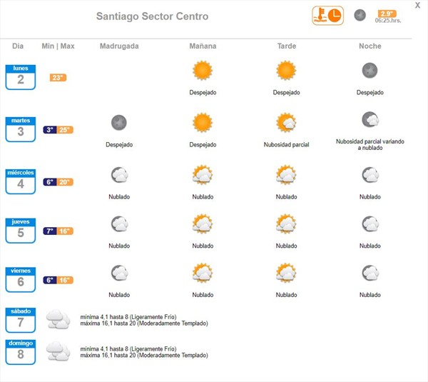 Temperaturas que se repetirían este martes, comenzando el día con 3 grados y una máxima de 25 grados en el centro de Santiago, según indica la Dirección Meteorológica de Chile.