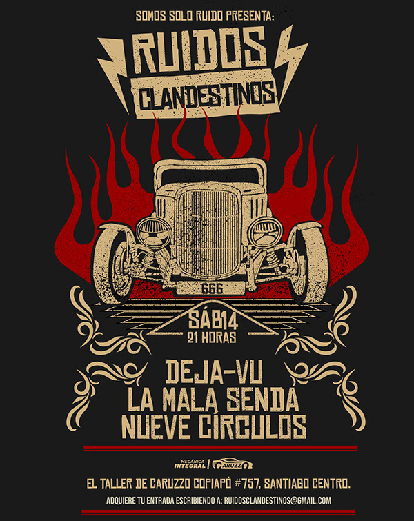 El barrio Diez de Julio temblará bajo una jornada de rock chileno, guitarras y amplificadores a tope. “Ruidos Clandestinos” reunirá a las bandas locales Nueve Círculos, La Mala Senda y Deja-Vu en un show especial que se llevará a cabo en una particular locación: un taller mecánico del tradicional sector capitalino de motores y mundo tuerca.