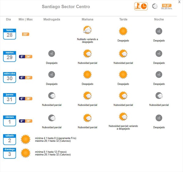 Noticias Cálido: Revisa el pronóstico del tiempo para este lunes en Santiago Este martes la mínima bajará unos grados. Por Hector Muñoz Tapia | 28 Oct, 2019. 08:26 hrs Este martes la mínima bajará unos grados. Por ADN.cl Bajo una mañana nublada con solo 10°C comenzará este lunes 28 de octubre Santiago, donde se espera una nueva jornada de movilizaciones. Mientras que la tarde estará totalmente despejada y la temperatura llegará a los 23°C. Según informó la Dirección Meteorológica de Chile, la mínima bajará unos grados este martes, marcando solo 5 grados, mientras que la máxima llegará a los 24 grados con un cielo con nubosidad parcial. Asimismo, para este miércoles se espera una gran ocilación térmica: habrá un día despejado con una mañana ligeramente fría con 6 grados, mientras que en la tarde se llegará a los 29 grados. Por su parte, este jueves 31 de octubre la mínima será de 6 grados y llegará a 28 grados bajo un cielo con nubosidad parcial. Temperatura que se repetirá este viernes. Puedes revisar aquí el tiempo para todas las ciudades del país. cálido pronóstico Jaime Bassa, abogado Constitucionalista: "Hoy día no hay prácticamente nadie que se niegue a una nueva Constitución" Chilavert ataca a Bielsa por sus dichos sobre la crisis en Chile Sigue a FUTURO.cl en Google Discover Recibe nuestros contenidos directamente en tu feed. Seguir en Google Contenido patrocinado