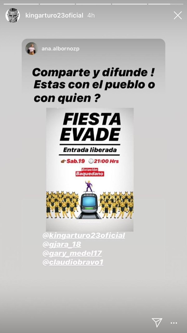 Noticias El enigmático mensaje sobre fiesta en Baquedano que Arturo Vidal borró de Instagram Hasta el momento, el volante del FC Barcelona no se ha pronunciado a la situación que vive Chile. Por Hector Muñoz Tapia | 19 Oct, 2019. 13:40 hrs Hasta el momento, el volante del FC Barcelona no se ha pronunciado a la situación que vive Chile. Hoy, Arturo Vidal publicó un enigmático mensaje a través de su cuenta de Instagram invitando a una fiesta en Plaza Baquedano. Debido a los incidentes que han ocurrido a lo largo de Santiago, el volante del FC Barcelona no se había pronunciado sobre las manifestaciones sociales. Sin embargo, a través de una historia de Instagram, Vidal compartió una invitación a una fiesta llamada «Evasión Masiva» en Baquedano a contar de las 19:00 horas. Pocos minutos después, el volante del Barcelona borró el posteo. Arturo Vidal Baquedano Santiago "Aguante Santiago": Matilda Svensson llega corriendo a Movistar Arena por manifestaciones en Santiago Nueva jornada de "cacerolazos" se tomó la manifestación de hoy en Santiago Sigue a FUTURO.cl en Google Discover Recibe nuestros contenidos directamente en tu feed. Seguir en Google Contenido patrocinado