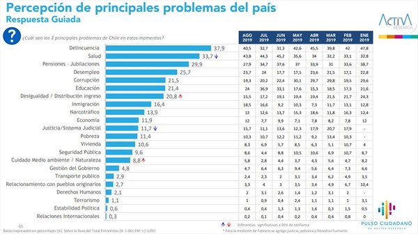 ACTITUD FUTURO Estos son los principales problemas que enfrenta Chile según la ciudadanía La delincuencia está en el primer puesto de la encuesta Pulso Ciudadano. Por Diego Puebla Hernández | 02 Oct, 2019. 11:08 hrs La delincuencia está en el primer puesto de la encuesta Pulso Ciudadano. Por ADN.cl La encuesta de Pulso Ciudadano de Activa Research de septiembre reveló los principales problemas que enfrenta actualmente Chile según los encuestados. En estos momentos los primeros puestos son liderados por la delincuencia con un 37,9%, seguida por salud con un 33,7%. El tercero se lo lleva las pensiones y jubilaciones, con un 29,9%, el cuarto el desempleo con un 25,7% y el quinto la corrupción con un 21,7%. Revisa aquí el listado completo: Chile Matías Gavilán sacó risas con revelación de su hermano Nicolás para el 18 de septiembre Mago casi pierde la mano en arriesgado truco con sierras eléctricas Sigue a FUTURO.cl en Google Discover Recibe nuestros contenidos directamente en tu feed. Seguir en Google Contenido patrocinado