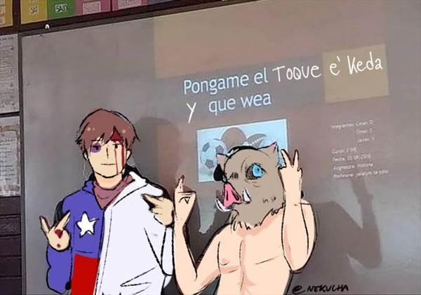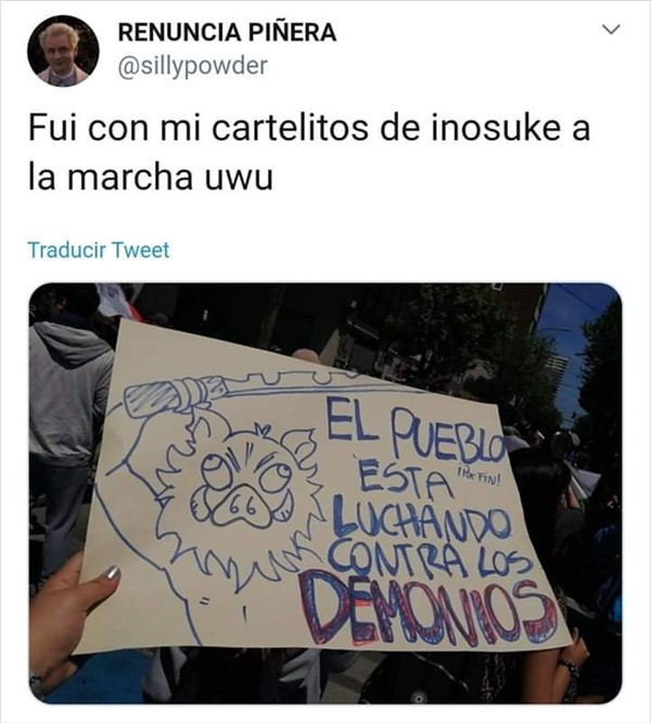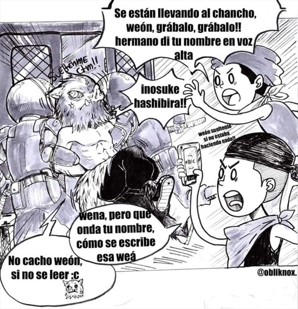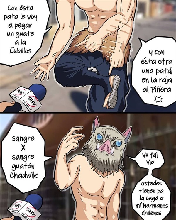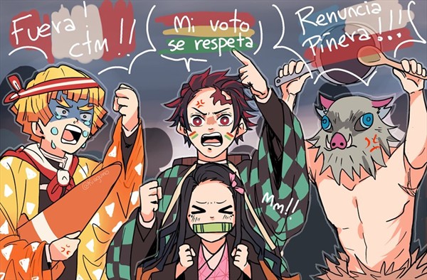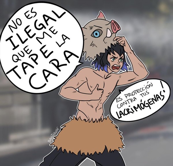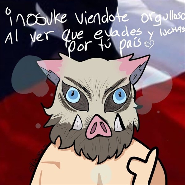 Noticias Inosuke de Kimetsu no Yaiba: el personaje de las manifestaciones chilenas La figura de uno de los animes más exitosos del 2019 se ha hecho presente a través de carteles e ilustraciones en las diversas manifestaciones de Chile. Por Rosa Figueroa | 23 Oct, 2019. 16:23 hrs La figura de uno de los animes más exitosos del 2019 se ha hecho presente a través de carteles e ilustraciones en las diversas manifestaciones de Chile. La creatividad en las manifestaciones de Chile no para. Además de los llamativos carteles que han protagonizado las marchas locales, también se destaca la utilización de la imagen de Inosuke, del anime Kimetsu no Yaiba, para protestar en contra de la crisis que se vive en el país. Inosuke en un cazador de demonio que cubre su rostro con una cabeza de jabalí y que se caracteriza por su torpeza. Son estas cualidades las mismas que han llamado la atención de los protestantes y los ha animado a utilizar su imagen. A lo largo de todo Chile se ha visto este personaje, el que es utilizado para enviar un mensaje potente y, sobre todo, rebelde. Su imagen se ha retratado en carteles e ilustraciones que han circulado por internet. Revisa las imágenes de Inosuke en el marco de las manifestaciones chilenas: Inosuke Kimetsu no Yaiba Fundación Benedetti rechazó el uso de un texto del escritor por parte de Sebastián Piñera 150 músicos chilenos piden dar término a la militarización en las calles Sigue a FUTURO.cl en Google Discover Recibe nuestros contenidos directamente en tu feed. Seguir en Google Contenido patrocinado