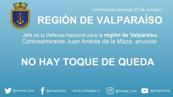 Esta mañana, la Intendencia de la región de Valparaíso anunció que no habrá toque de queda durante la jornada de día domingo 27 de octubre.