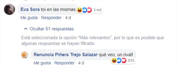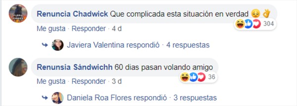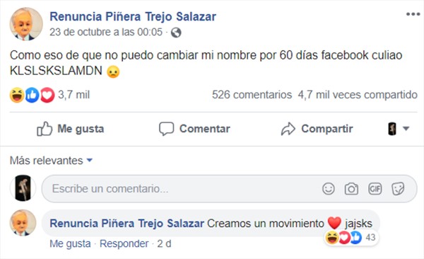 Noticias Jóvenes cambian su nombre en Facebook inspirados en la crisis social de Chile Nombres como "Cace Rolita" o "Eva Sora" se transformaron en viral. Por Diego Puebla Hernández | 28 Oct, 2019. 11:04 hrs Nombres como «Cace Rolita» o «Eva Sora» se transformaron en viral. Con motivo de las masivas manifestaciones, varios jóvenes se cambiaron sus nombres de Facebook con consignas o frases alusivas a las movilizaciones. Sin embargo, muchos de ellos no sabían que la red social te permite volver a cambiar tu usuario luego de 60 días, por lo que deberán estar dos meses con dichos nombres. Gracias a la publicación de «Renuncia Piñera Trejo Salazar», donde dice que «como es eso de que no puedo cambiar mi nombre por 60 días facebook ‘culiao'», aparecieron otros usuarios que tienen nombres como «Eva Sora», «Cace Rolita» y «Lama Tafachos». facebook Mira el tráiler final de "The Rise of Skywalker", próximo film de Star Wars INDH presenta querella por tortura sexual de Carabineros a joven Sigue a FUTURO.cl en Google Discover Recibe nuestros contenidos directamente en tu feed. Seguir en Google Contenido patrocinado