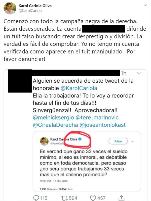La acusación fue realizada por una cuent que sostenía que «¿alguien se acuerda de este tuit de la honorable Karol Cariola? ¡Ella, la trabajadora! Te lo voy a recordar hasta el fin de tus días. Sinvergüenza. Aprovechadora».