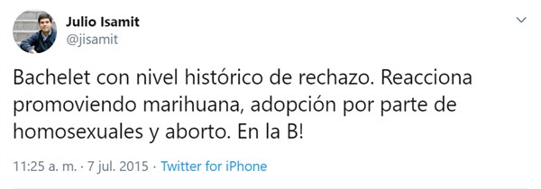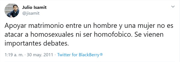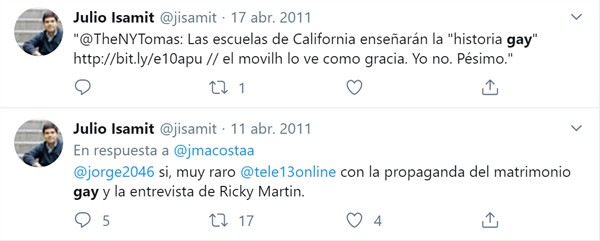 Una serie de comentarios en su cuenta de Twitter han causado indignación respecto al recientemente nombrado ministro de Bienes Nacionales, Julio Isamit, los que apuntan principalmente contra el matrimonio entre personas del mismo sexo.
