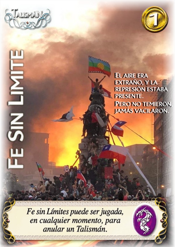 Se trata de «Fe sin límites», una carta de papel foil y borde troquelado que tiene como imagen central la viralizada fotografía de la «marcha más grande de Chile», donde aparece la estatua del General Baquedano, en Plaza Italia, rodeada de manifestantes, banderas, humo y un naranjo atardecer.