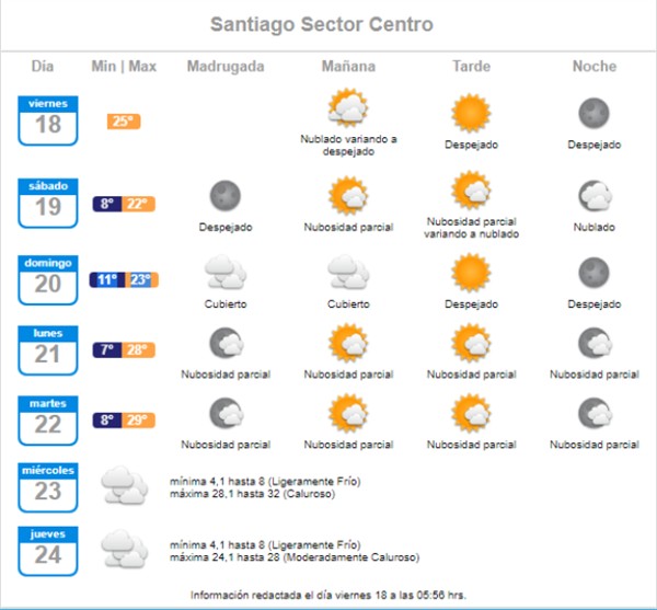 Noticias Nublado, pero caluroso: Revisa el pronóstico del tiempo para este viernes en Santiago Además, se espera un fin de semana templado y con nubosidad parcial. Por Hector Muñoz Tapia | 18 Oct, 2019. 07:55 hrs Además, se espera un fin de semana templado y con nubosidad parcial. Por ADN.cl Si bien habrá alta nubosidad durante buena parte de la jornada, este viernes 18 de octubre en la región Metropolitana, será una jornada calurosa, con una mínima de 8°C y una máxima de 25°C. Según informó la Dirección Meteorológica de Chile, para este fin de semana se espera nuevamente jornadas de nubes y sol, el sábado 19 con una mínima de 8 grados y una máxima de 22°C, mientras que el domingo 20 se pronostica una jornada que transitará de los cielos cubiertos a los despejados, con temperaturas entre los 11°C y 23°C. Para la próxima semana, se esperan altas temperaturas. Puedes revisar aquí el pronóstico del tiempo para todas las ciudades de Chile. nublado pronóstico Francisco Chahuán, senador RN: "Hay que tener mano inflexible y no tolerar la destrucción del transporte público" Mujer dejó morir a su marido con hipoglucemia tras haber contratado un seguro de vida Sigue a FUTURO.cl en Google Discover Recibe nuestros contenidos directamente en tu feed. Seguir en Google Contenido patrocinado